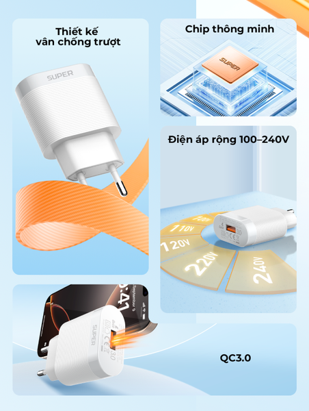 Để tránh mua phải hàng giả, hàng kém chất lượng, người dùng nên lựa chọn sản phẩm từ các thương hiệu uy tín như SUPER. Các mẫu củ sạc điện thoại của SUPER được thiết kế hiện đại, có đầy đủ chứng nhận an toàn, tương thích với nhiều thiết bị: